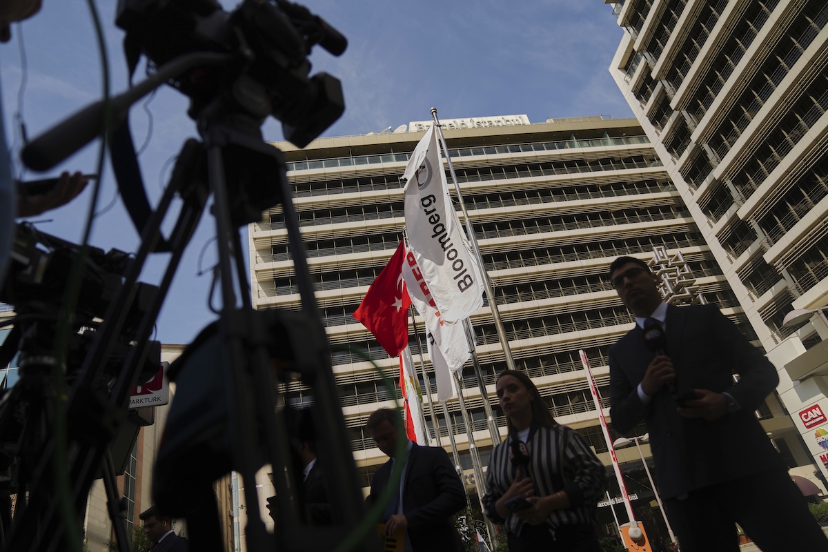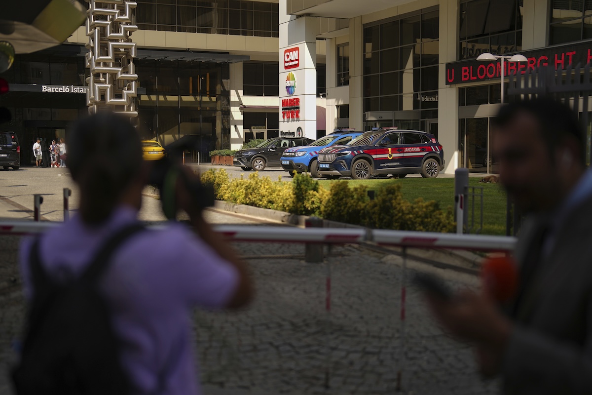 Journalists work outside Haberturk and ShowTv news broadcasters offices, both part of Turkish Can Holding media group, in Istanbul, Turkey, Thursday, Sept. 11, 2025. (AP Photo/Francisco Seco)